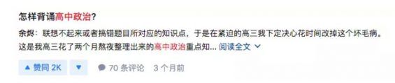 比如上面这个问题,与之相匹配的内容可能就是高中政治知识集合,高中政治背诵口诀等内容。 文章: 内容是能覆盖所有问题的,所以决定了有些内容无法找到匹配的回答,这些内容就可以用来铺设关键词。 我的操作是每天换一个二级关键词来发,并且回答的内容也可以同步到文章来。 2.3 找热点 热点是起量最快的方式,没有之一。而热点的表现方式就是关键词的热度变化,这一点可以通过百度指数和微信指数来观察。 具体可以看我之前写的聊聊蹭热点这事。而且有些关键词在知乎是没出现过的,比如期中当时我判断量会起来,然而知乎没有相对应的关键词,于是我的回答顺势上位,最终获得了几万的阅读量。 总结一下:策略不是相互割裂的,而是逐渐相辅相成的,第二条第三条都是构筑在第一条的基础之上,内容才是核心。 三、引流策略 引流就核心一点,让用户在任何能看得到的地方看到你,并记住你(前提是别违反知乎规则,开个盐选会员保平安)。用户从知乎跑去公众号搜索你的名字并关注你是一件成本很高的事情,所以一定要给用户动机。 3.1 个性签名 这个不用多说了,基本上是最常见的广告位了。但千万不要只放一个公众号名称,一定要给用户动机,比如我:公众号名称+每天更新一份学习资料(仅供参考) 3.2 想法 想法其实类似朋友圈,不是公开的内容,所以这一块知乎管的不严,是打广告的好地方,而且据我观察,我的想法阅读量都不差。 3.3 知乎专栏 知乎专栏其实就是一个收录文章的地方,简介也可以引流,但专栏引流效率不高,知乎给的权重不够。 3.4 私信 对于在文章里引流,知乎的态度一直都比较迷,我也没摸清楚。但私信引流是比较好的方式,虽然比较累,但可以加盐值。 在养回答那里说过,引导用户关注,你发资料给它,这段时间内容本身是无法引流的,所以可以把私信做成标准化,复制粘贴发给用户就行了,但一定要给动机。