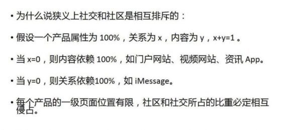 如果把所有带有社区功能的产品和纯社区产品画一个坐标轴,最左侧是内容属性,最右侧是社交属性。我们很容易在这个坐标轴上找到各大产品的定位,而不是单一的说一个产品是什么单一属性。