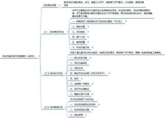 本模板是结合笔者从多年来的活动运营经验,得出的一套比较通用的活动模板,帮助运营小伙伴们理清活动策划的思路,快速完成一个活动策划方案。 本模板有一定适用范围,有自身经验的局限性,表达亦不能完全,请结合实际情况参考。 按照模板去写并不是目的,快速把活动相关思路理清楚才是重点。 活动的方案策划流程按照不同时间阶段,主要分为以下几个部分: 【活动策划阶段】明确目标、确定主题、活动描述、推广计划、费用预算、形成方案文档 【活动执行阶段】细化方案、活动审批、项目立项、跟进开发排期(涉及开发)、上线验收、全程推广与跟进、各环节协调配合、精细化用户分层 【活动复盘阶段】目标达成情况、从开始到结束遇到的问题、值得继续发扬的、必须防止再次发生的、有待改进提升的、其他问题(包括人和事) 一、活动策划阶段 本环节主要是在进行方案形成之前明确活动目标、形成活动雏形、活动所需资源概况等,尽可能把影响决策的问题放在这个环节想清楚,再开始后续的细化执行,避免推翻重来浪费工作量。 1.明确目标 活动的目标是什么? 首先明确,策划本次活动是什么目的?品牌?拉新?促活?营销转化?一般来说,活动是辅助完成整体或部分目标的手段。 比如说,这个季度需要冲刺3000万的销售额,那么本次围绕这个大目标策划的的活动目标就很明确了:一定是为了提升销售转化。 活动预期:希望通过活动,达到一个什么效果。 做活动之前,通过经验预估也好,精密的推演也好(这里不详细展开说),有一个合理的预期,没有预期,成本估计也是算不出来的。 活动有没有必要做? 先明确目标,想好要干嘛,再决定怎么干。实际中容易出现倒置的情况,比如,要过情人节了,做个抽奖活动吧…… 切记:不是为了做活动而做活动,而是因为这个活动是实现这个目标的最佳手段,才做活动。活动目标清晰了,后续的人群,投放渠道,预算才能清楚地做下去。 能不能实现? 确定了活动的目标和必要性,就要考虑可行性,也就是说,你想做,但是以当前的现状以及资源,能不能支撑完成? 举个栗子: 为了提升设计师UGC投稿量,我们准备在Q3策划一场设计师大赛,这里需要市场部、培训部、产品技术等多个部门协作完成,并涉及一定的预算投入。然鹅下半年市场部需要开展全国巡展,没有市场人力支援; 开发也有其他0号项目进行中,不可能有开发支援支撑,同时公司层面基于开源节流的考虑,此类活动预算过大,现阶段是不予考虑的,因此,在现阶段,该活动是不具备可行性的,理应尽快寻找更合适的替代方案。 活动能不能持续、复用? 咱们做一个活动或多或少都要占用一些人力资源,甚至开发资源,如果是一次性的活动,那其实是很可惜的。但是如果一次性做成长期性质的,却往往要一次性投入更多的成本,在效果不明确的前提下做,风险极大。那怎么办呢? 一个经过市场验证的产品功能给运营带来的作用就跟打怪装备升级了一一样。 活动,其实是一个新产品的前期试探、验证,咱们在策划阶段要具有前瞻性。假如验证活动有效果,那么这类活动是不是可以复用或者做成持续性的活动?既然是验证,那么涉及到产品开发的是不是可以先简单做? 否则浪费大量人力开发,结果验证结果不理想,那么这锅运营不背谁背?所以需要想清楚了再去规划活动的形式,把风险点降低。 充分理解影响这个目标的因素和现状,才好策划对应的活动,做预算,有靠谱的预期,方便后续分析复盘。 2.确定主题 好的主题是活动成功的一半,主题一定要吸引人,让人一看就知道是个什么活动,用户如何参与,可以得到什么样的好处。核心要简单粗暴, 比如,下单立减30元,第二件半价,免费抽iPhone X……虚无缥缈文绉绉的要不得。 常见的主题思路有很多,比如:往届主题的延续、行业成功热门活动的参照、社会热点的有机结合、以目标为导向的大胆创新、结合往期活动复盘,避免重新踩坑… 参考竞品也是其中一种方式,但是参考竞品要挖到精髓,学到点子上,要有必要的延伸,否则别人看一眼,给你的评价只有2个字:抄袭! 3.活动描述 确定好了主题,就要确定活动的玩法了。起码要包含的几个元素:时间 / 对象 / 简述 / 流程 / 规则说明 活动时间,一般是区间格式表达,xx时间-xx时间。有严格时间控制的,还要精确到分秒。比如双11活动限时抢购等。 有些小伙伴不管是方案落地还是出街的活动页面,都不写年份,其实不是一个好习惯,随着时间推移,无论自己日后复盘还是活动对外宣传,都会让人感觉不清晰,甚至还有可能产生争议。 活动对象,是直接表述什么人可以参与这个活动,什么人不可以。比如周年庆活动,只限购买了软件的老用户参与。 那么哪些人符合条件哪些不符合,就自行对号入座了。否则你如果不写,新用户买了你的产品结果没有享受到这个折扣,就有的争论了。 对活动主题做简单展开描述,几句话就能让其他环节的同事明白具体是个什么事,方便他们评估实现难度,对活动有一个整体上初步概念。 比如下单立减30元,是下单当下就减还是事后统一返还抵扣券,免费抽iPhone X 是实时开奖还是固定时间开奖,不同的方案实现的难度肯定是不一样的。 对活动的流程做个简单又清晰的表达,这是对活动描述必不可少的补充说明。 一般情况下依托时间轴,从预热阶段开始、到活动上线、活动间流程(不同玩法节奏不同)