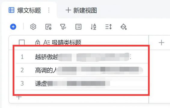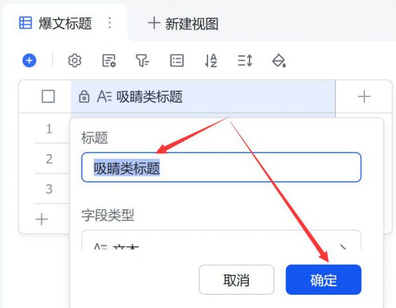 所以,接下来我们要在飞书多维表格中,设置相同的列,来接受coze的输出结果,比如这里我们就要在多维表格中,设置一个“吸睛类标题”的列,如图所示:
