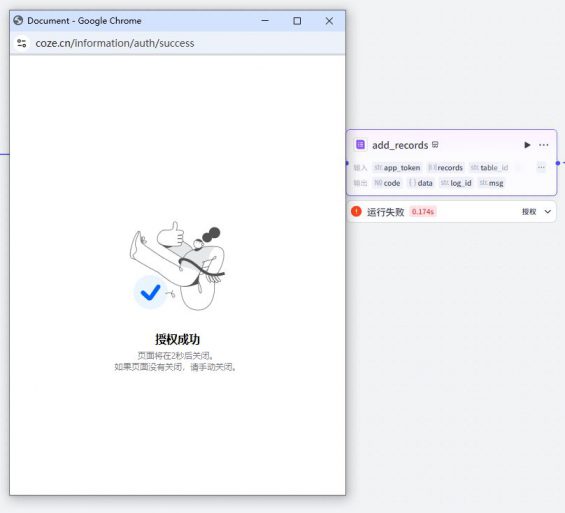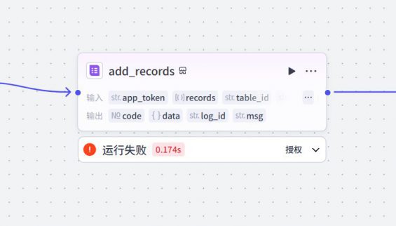 这里提示的是我们的飞书表格未授权,修复方法也很简单,先点击运行失败最右边的授权文字