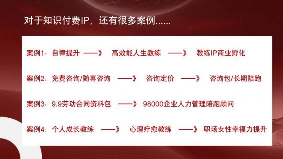 我建议大家,第一个产品可以用1V1咨询或者系统课的形式来承接,作为低客单价产品,后续升单主要靠训练营或者陪跑这种有明确周期的产品,效果会更好。