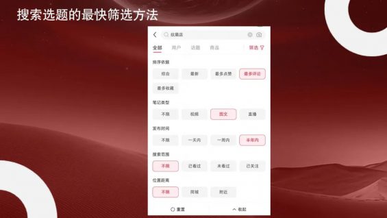第三个筛选项是“半年内”。2022年和2023年的笔记和选题大多过时了,不值得对标。如果同样的用户群体之前已经看过相关选题,再发类似的,他们不会点开。