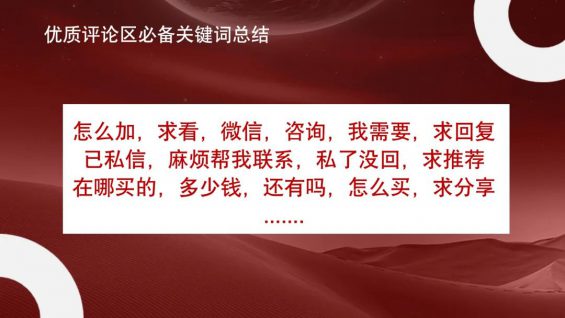 总结一下,如果在评论区看到“怎么加、求看、微信、咨询、还有吗、已私信、怎么买、求推荐、求回复”等评论,一定要重点关注,这些都是精准优质客资的关键词。