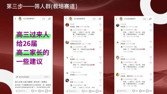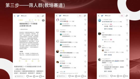 第三步是筛人群,这在发笔记或找对标时非常关键。要判断对标笔记的目标人群是否和自己一致,我给大家举几个教培赛道的例子。