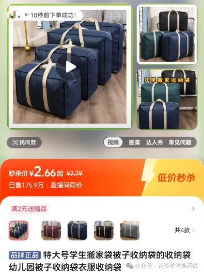 1. 所有需要往宿舍里搬东西的住校生,你要不要袋子?肯定要。 所以你看,到了八月份,这款单品的商品名里面,就添加了“大学生搬家袋”这样具体的人群、场景词。 但是看到这里,这款热销单品,和你这样的普通人有关系吗? 没有什么关系。 因为在抖音上,这样的袋子只卖2.66。 这么低的价格,普通人是没有办法参与进去的! 你要直播、要有供应链、要发货、要售后…… 要干的事情太多了,完了累死累活自己赚不到什么钱。 这样的生意,你就算干了,你也没有利润。