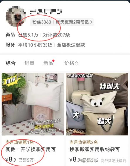 而这样卖到8.9块的搬家袋,在小红书上,这个号已经累计销售了5万多单。 并且这个5万单的热销卖家,他的账号粉丝数只有3000粉丝。 更神奇的是,现在你去小红书上面搜索商品:大学生搬家袋。 你会发现,根本就没有多少人在卖这款热销产品。 所以这个3000粉的账号,才能做出5万单的销量。 因为根本没有人跟他竞争。