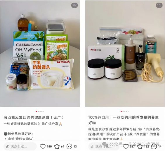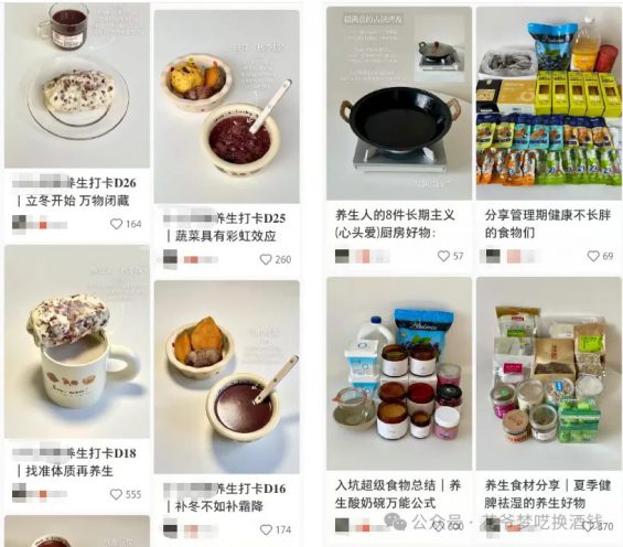 你看下面左图,这个账号早期发的健康好物,都是自己在家自己做吃的。