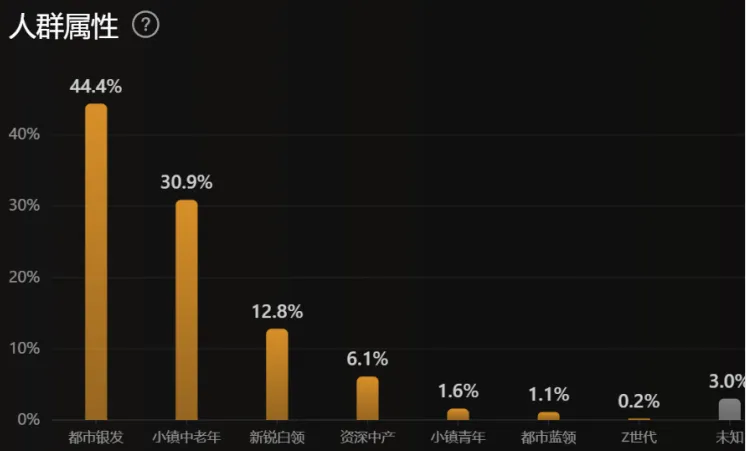 从人群属性来看,“都市银发”和“小镇中老年”是主体,像“新锐白领”“产业工人”这些群体占比特别少。
