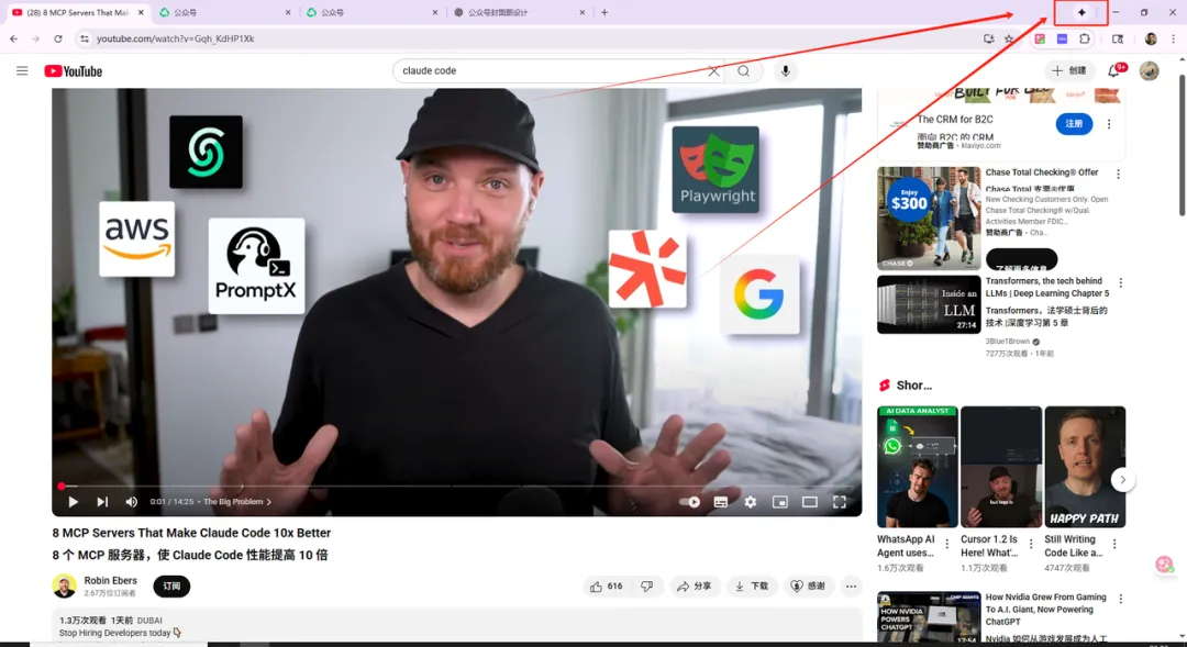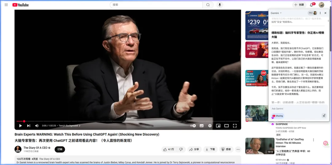 3、确定好选中的视频(你的选题),然后打开浏览器的AI,将提示词给它。