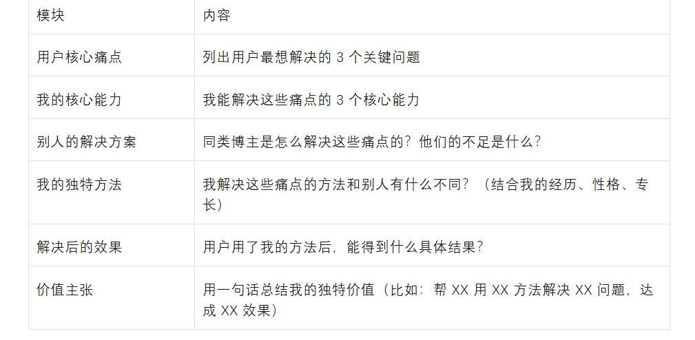 第三斧:我能提供什么独特价值?(价值锚点) 我能提供什么独特价值?别再说 “我能帮你变优秀”,具体到能解决什么问题!找到了 “我是谁” 和 “我为谁服务”,最后一步就是 “我能提供什么独特价值”—— 这是你人设的核心竞争力,是用户关注你而不是别人的理由。 独特价值不是 “我什么都能做”,而是 “我能解决目标用户关键问题的核心能力”,而且这种能力最好是别人不容易复制的。找到核心能力:你最擅长解决用户的哪个问题 核心能力要和用户的痛点、需求强绑定。比如你的专长是 “Excel”,用户的痛点是 “做报表慢”,那你的核心能力就是 “用 Excel 技巧帮职场新人快速做报表”;你的经历是 “单亲妈妈考研上岸”,用户的痛点是 “想学习但没时间”,那你的核心能力就是 “帮宝妈高效利用碎片化时间学习”。 核心能力要 “聚焦”,别贪多。你可能有很多能力,但找到一个最突出、最能解决用户关键问题的,把它打透。比如同样是做美食,有人聚焦 “快手早餐”,有人聚焦 “减脂餐”,有人聚焦 “家常菜调味”—— 聚焦才能专业,专业才能被记住。 我的一个好朋友,她的核心能力是 “讲故事”,用户的痛点是 “孩子不爱听道理,总哭闹”。她的独特价值就是 “用故事帮宝妈解决孩子哭闹问题”,比如 “孩子挑食?讲个‘小青菜历险记’的故事试试”“孩子怕黑?这个‘小夜灯的故事’能帮到你”。她的内容特别受欢迎,因为核心能力精准解决了用户痛点。