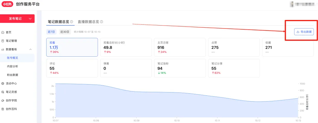 打开小红书创作者中心,点击数据看板、内容分析,选择时间范围:近30天,导出Excel表格