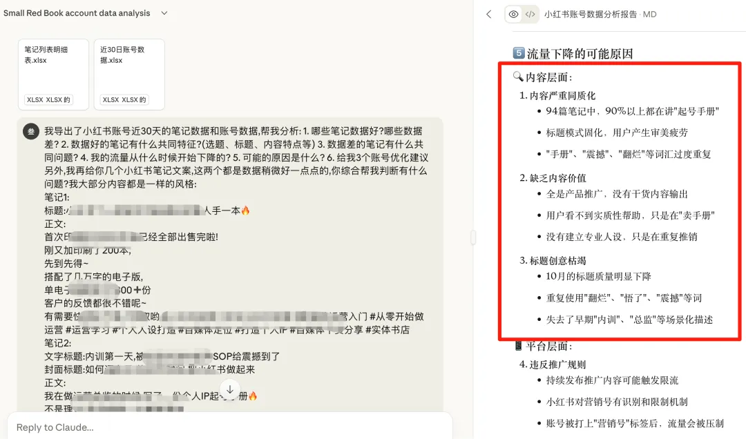 但只有数据,AI 很难判断问题在哪,所以还需要给 AI 发你最近3~4篇笔记,包含图片、标题和文案等,如果是视频的,要包含逐字稿,提供详细信息, AI 才能精准判断问题。