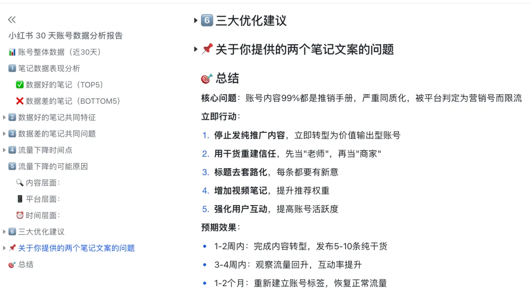 你还可以让 AI 给你一个30天优化SOP,AI 会给你完整的优化方向、笔记选题,甚至还能生成笔记文案。