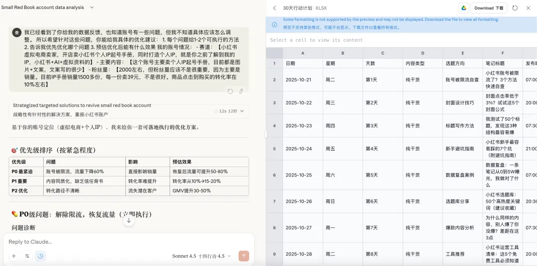所以,你不用再去找人看号啦,这个方法非常简单,只要有一个能对话、能读取表格数据的AI,自己就能做账号诊断。
