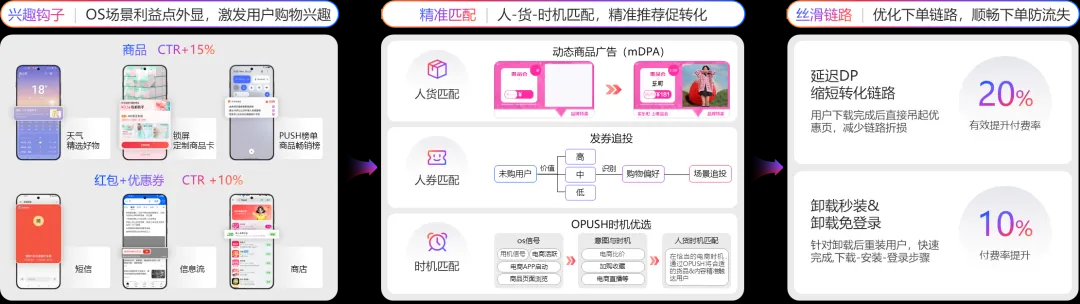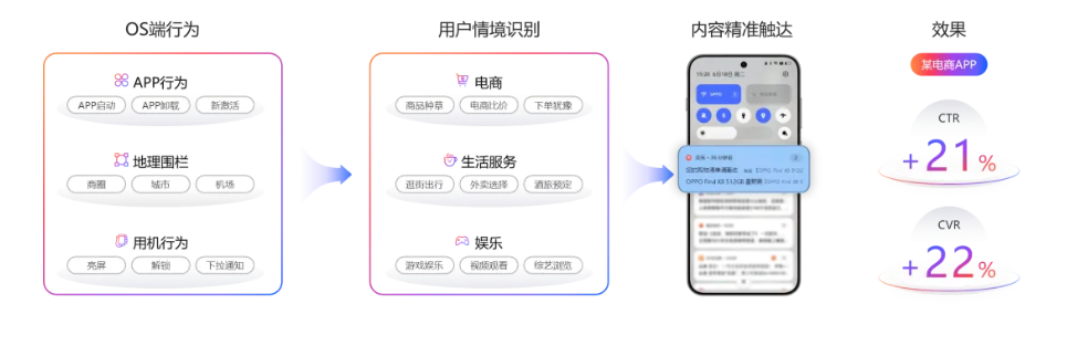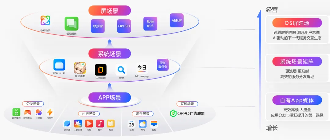 场景破域:用户运营阵地从 App 扩展到锁屏、全搜、负一屏等系统场景,再扩展到OPUSH、AI助手、悬浮窗等OS屏场景,连接起用户离散却蓬勃的需求,让APP对用户的影响可以在任何合适的时机发生。