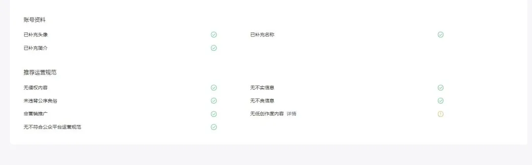 现在的抖音,快手,小红书等平台都会有账号检测功能,因为它们都是算法推荐的平台,创作者需要明白自己的内容为什么没有被推荐,有哪些地方不符合平台的要求,所以平台推出这个功能也是双向利好,创作者知道自己的问题所在,平台也可以利用它让创作者输出符合要求的内容。 但是同样是内容创作平台,微信公众号以前就没有,因为它以前是闭环的,有粉丝就有流量,而现在慢慢开放,变成了微信内容生态推荐机制,所以也是需要一个账号检测功能,省得创作者总是去社区问为什么没有流量。 基于此,微信公众号已经在内测账号检测功能,在账号成长菜单里就可以看到这个功能,使用的条件是累计发文活跃条数≥12,且当前不处于被惩罚状态。 而这个功能的好处就是可以检测你的账号问题,比如账号资料有没有完整,内容质量是不是存在问题,如果存在问题可能就是不给你推荐流量的原因。 除了图里不符合微信公众号平台的要求之外,ai创作的内容把控也变得严格了。九月份官方发布了一则公告,里面就提到会加强ai内容标识,比如内容含有ai创作的成分,就会在底部提示内容由ai生成。 影响大的ai生成的内容,纯ai生成的内容平台也是不推荐的,如果你是用ai进行了辅助创作,那可以用腾讯官方的ai内容检测来看看有没有检测到ai创作,如果有的话可以适当手动修改一点。 检测地址:https://matrix.tencent.com/ai-detect/?lang=zh |