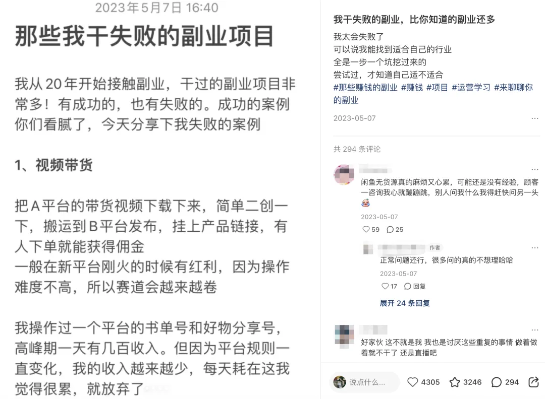 03 我为什么All in小红书? 在小红书上刚跑通变现的时候,我还做了很多类型的副业,后面专门写了一个复盘,还是个小爆文。 我做过抖音游戏号、抖音虚拟资料、多多视频搬运、闲鱼无货源电商、视频号带货……说实话每一个都挣了点钱,但不多。 放弃的原因是,我把项目干成了「上班」。 前面讲的这些项目,几乎都没有积累,没有复利,你干了就有收入,不干就没有了。 举个例子,多多视频搬运,收入天花板取决于你搬了多少视频,有多少爆款。一旦有一天不搬了,收入就断了。而且平台随时会掐掉搬运的内容。 从投资角度讲,这就不是个好的项目,好的投资项目是要让自己拿到睡后收入的,这些很明显不行。 尤其是闲鱼电商,真的要点名批评,客服真的巨烦,一个几十块钱的产品,卖出去我最多赚一二十块钱,客服消息真的巨多,这些人也巨烦,挣得钱还不够精神损失费,是我放弃的最快的项目。 最后决定做小红书,是看到平台的发展趋势确实在上升,另外,我可以借助这个平台打造个人IP。 那会我不会拍口播,拍视频我也觉得很烦,只能写文字,也只有小红书和公众号是最适合我的。 为什么会做 IP ? 我看《纳瓦尔宝典》这本书比较早,里面提到财富放大的 3 种杠杆:劳动力杠杆、资本杠杆、复制边际成本为零的产品。 我选择的是第三种,也是作者最推崇的一种,这里面就包括了 IP 。 现在做的虚拟电商,也是遵循着第三种杠杆而诞生的,这本书确实改变了我很多,非常建议大家去看看。