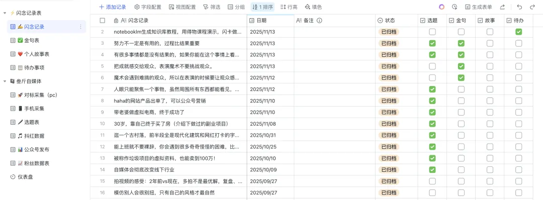 5.2. 都建立了内容生产系统 最自媒体最忌讳的就是凭感觉创作,那什么是内容生产系统?就是把做内容变得标准化、流程化、批量化。 内容生产系统包含3个核心:选题库、内容SOP、数据复盘流程。 我还专门搭建了一套内容生产系统的 SOP ,在刷小红书、抖音的同时,可以积攒选题库,并且可以通过 AI 加工,生成一篇笔记和文章。数据复盘也有 AI 协助,效率会高很多。 5.3. 设计了完整的变现闭环 什么是变现闭环?就是从流量到变现的完整路径,比如我的,卖货引流 → 转化 → 成交 → 复购。 新手做自媒体不赚钱,最大的问题就在于把涨粉、互动当作自己的目标。 这些只是过程,不应该是目标。 在自媒体上赚钱的人,90%不会盯着自己的粉丝和点赞看(除非接广告变现)。 我的变现闭环前面也分享过,就不再说了,真的建议如果你要做自媒体,一定要有自己的变现体系。 |