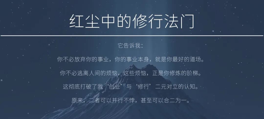 这彻底打破了我对修行和创业二元对立的认知 —— 不用放弃事业,事业本身就是最好的修行道场;也不用逃离烦恼,烦恼都是修炼的阶梯。二者可以不相悖、合二为一。
