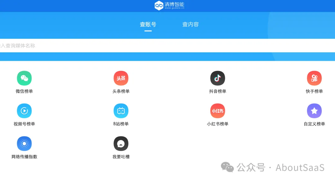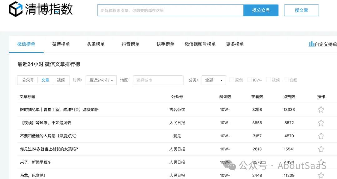 新媒体榜单、指数查询工具。清博智能旗下产品,提供微信、微博、视频号、B站、小红书、头条等榜单。