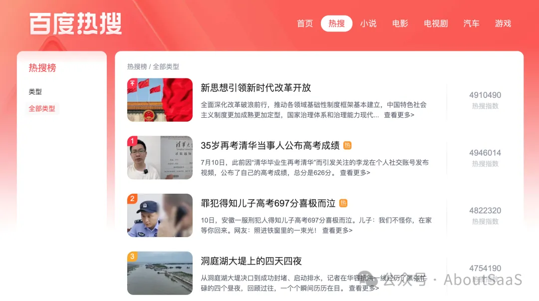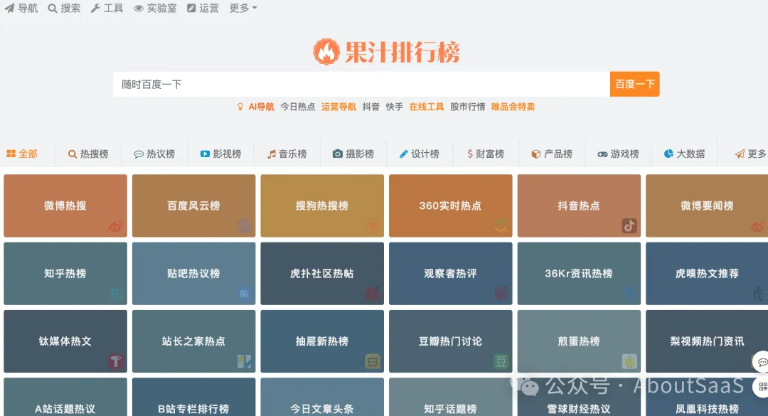 一个用于追踪和分析社会事件、网络谣言及其影响力的工具。其热搜榜覆盖抖音、微博、知乎、头条、B站、快手和百度等平台。