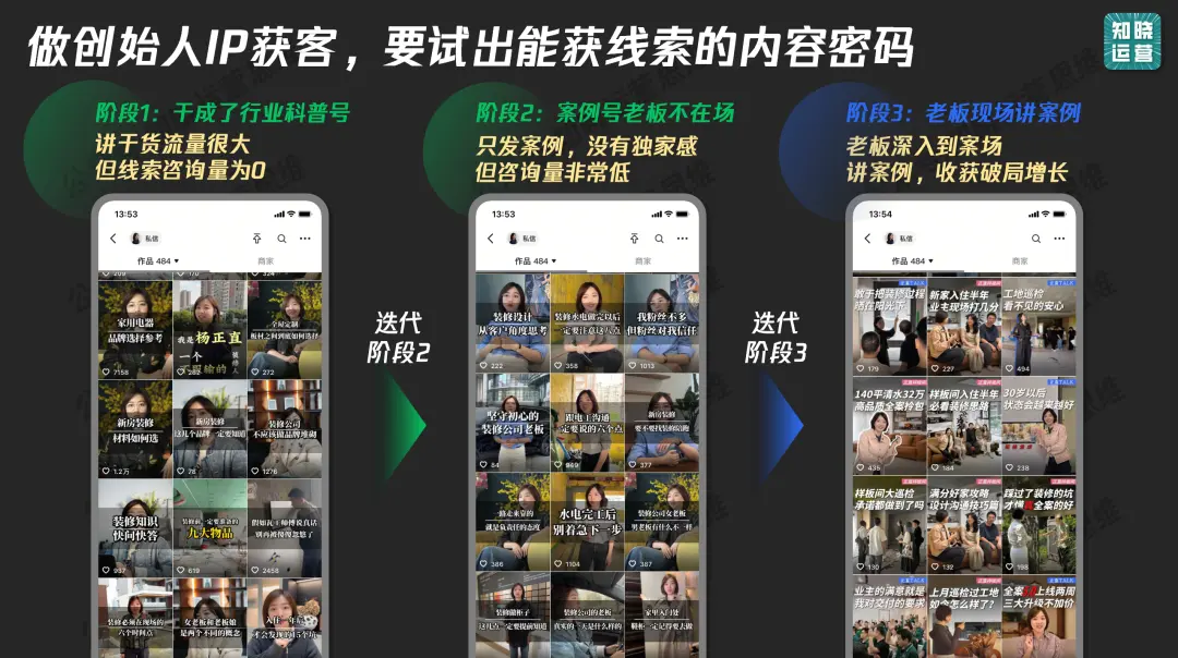 老板IP不光是露个脸,更是解决获客成本高、转化率低、组织获客能力弱的关键。老板作为一号位亲自下场,能调动公司所有资源,实现从0到1的突破。 1、避开爆款坑和案例坑优家工场做老板IP也踩过坑,经理: 第一个坑,盲目追爆款,做成了行业科普号 团队一开始学网上的爆款方法论,拍了几十个热门话题。流量确实有,比如百万级曝光,但咨询量是零。最后想明白了,老板做IP是为了服务客户、做生意,而不是当网红拿曝光量。 第二个坑,光发案例,缺自我独特性的证言 后来他们又做了一次迭代,开始发大量实景案例,各种风格都有,都是成都真实业主家,也并不是小红书的效果图。 那这次迭代的结果?还是不理想。 流量在5000到2万,有人收藏,但咨询没超过5个。客户看完还是没办法解决用户最后的心理关口:案例不错,但我为啥非要找你装? 发现问题后,他们也重新思考,怎么让用户看了内容就想找我? 那一定是需要重构能获客的内容逻辑,第一内容要素,是一个能值得被信任的老板,而不是躲在品牌后数钱,所以老板IP是需要坚持; 第二个内容要素,用户相信所见即所得,用户天性就喜欢从别人模样中找出自己是否可以复刻的路径,所以案例是最有成交力的素材,所以案例也一定要讲。 那要真正获得客户线索的破局点就是,让老板亲自讲真实客户案例,这就是第二次大的迭代。