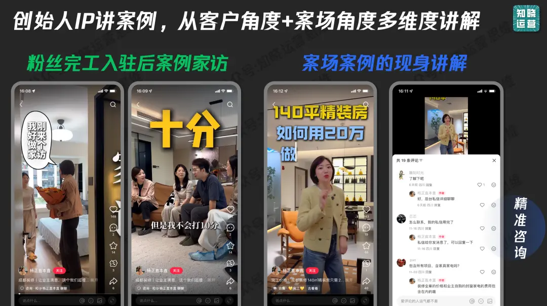 就算是讲案例,也可以从客户口中讲,从老板现场拆解讲,不同视角丰富内容呈现到用户的需求的刺激。 在这个调整过后,优家工场发现坚持拍有这五点要素的内容,哪怕流量只有5000到10万,比之前的百万播放是下来了不少,但一条视频也能带来5到30条咨询。 把优质的自然流获客视频,再用投放放大后,转化率依然在线。 3、老板IP获客,一定是真诚+利他+找对位置老板IP要做精不做滥,这个打法更适合中小型企业。为啥? 很简单,大品牌有影响力,一般不需要老板亲自下场。做老板IP,就是用一号位的服务心态去展示自己,赢得客户的那张信任票,从而转到私信,并导流到私域中。 第一,简单、真诚、利他 不需要所谓的爆款套路,就拍公司实打实能给客户带来的价值,真诚服务,专注做对客户有用的内容。 第二,找到自己的生态位 IP的特质不是包装出来的,是在服务过程中“挖”出来的,是靠客户反馈和好内容慢慢“长”出来的。每个老板特质不同,把自己最擅长的做到极致,让客户记住你。 第三,客户和团队才是真素材 运营团队强不在编故事,而在能发现客户身上的事、团队每天解决的问题。真实的交付、培训、内部会议都是好内容。 第四,规模与心态 优家工场的三个平台粉丝加起来刚过10万,已经足够在第一阶段的破局。 老板做IP不是为了当网红,是让真有需求的客户精准找到你。别买账号,从0到1积累粉丝的过程,那种对每个粉丝的敬畏和重视,本身就是组织能力的锻炼。 第二阶段,全域放大:多角色矩阵,承接不同客户老板IP跑通后,新问题来了:获客能力是不是太依赖老板一个人了?这是很脆弱的状态。 优家工场也意识到,组织获客能力得持续,不能全压在老板IP一个人的身上。 既然团队是老板敢拍真实内容的底气,那就把团队也推到前台,实现更精准的获客。但这不能是简单地把老板的账号和内容复制几遍。 他们不做同一个人设的多个账号,而是让服务链条上的不同角色都参与进来,这样内容更透明,用户更能看清全貌。 1、按客户决策习惯布局多账号优家工场的多账号体系,是基于客户怎么找信息、怎么做决定来设计的。 因为从客户找装修时,会关注不同的视角,所以在账号矩阵搭建一定是多视角: 品牌号(KOB账号):适合看重公司规模、公司实力、行业背书、怕小公司跑路的客户,他们习惯直接找品牌官方号进行咨询。 老板IP号:适合看了很多案例和品牌号后,想通过老板找更合适的设计师或要点额外优惠的客户。 设计师号/工地号(KOS账号):同样也是人设IP类账号,势能虽然没有老板IP高,但适合侧重需求明确,想找到靠谱设计师来帮忙给到建议和后续服务,或者想看真实交付细节的客户。
