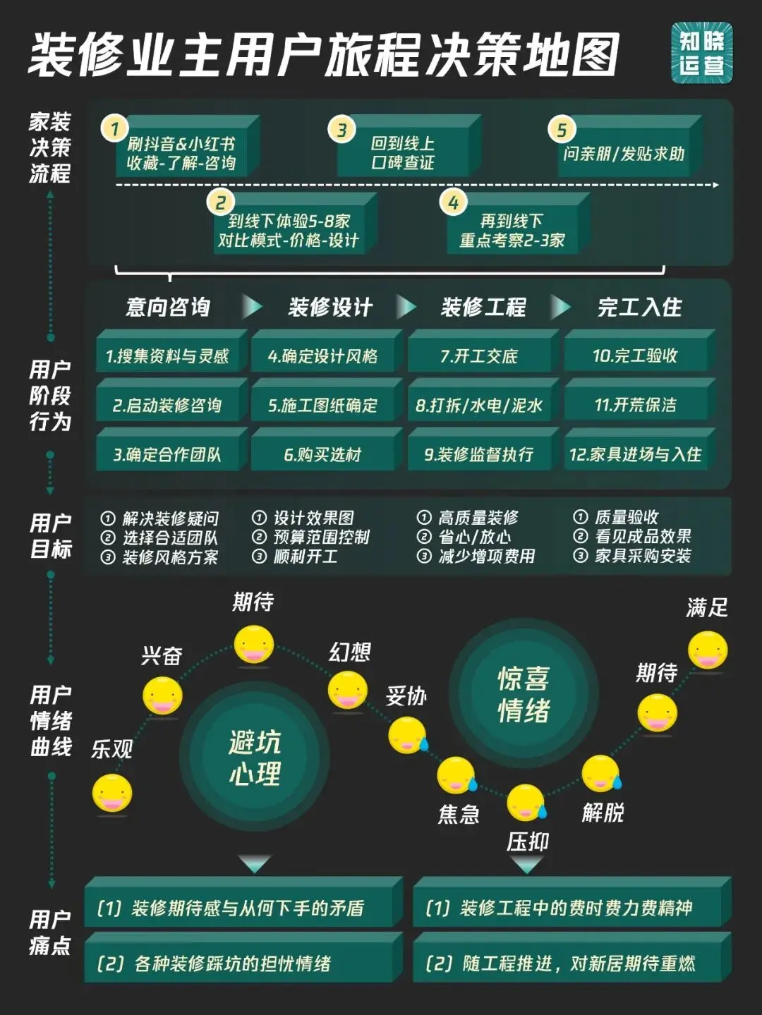 优家工场搭建了品牌号+老板号+设计师号+工地号这套的账号矩阵组合。 从本质上,并不是一个账号换汤不换药的矩阵复制,是为了覆盖客户多样化的搜索和决策习惯,从而获得需求多样化切入的精准客资。 2、多维度视角呈现+投流放大获客势能做多角色的账号矩阵的好处是,能把同一个案例可以从不同角度讲,并且能做到一鱼多吃的内容玩法: 官方号,讲整体落地过程、公司配置、最终效果和总花费,体现公司理念; 老板号,重点讲和客户的互动、客户真实评价、解决问题的过程; 设计师号,精细讲解收纳、配色、功能细节,这些官号和老板号是很难讲透。 这样多维度展示,客户得到的信息更有效。 无论是设计师号还是工地号,展示的都应该是团队能力,不是个人能力,如果账号太突出个人,人一走,账号就废了,有风险。 另外,做矩阵一定要迎合平台的商业化趋势,不能因为团队擅长做自然流就跟平台趋势硬扛,那样会限制获客天花板。 正确的思路是,用更高的转化率去对冲商业化的成本。 即对于自然流优秀获客的内容,进行持续投放加热,更好地利用平台商业化能力帮助更高效地找到精准客户。 别在获客环节省钱,要在转化环节赚钱。 哪怕是头部企业战略性投流,他们的获客数量和成本,也低于那些不愿花钱的公司。只有提升组织能力和内容质量,把转化率做高,才能有效降低获客成本。 第三阶段,私域转化:从步步紧逼到经营信任前两个阶段,侧重获客环节上,通过公域和全域的努力,优家工场拿到了精准线索。但如果还用传统那套转化方式,照样转化不动。 1、传统转化方式,让用户只想逃传统的家装做线索转化,逻辑是牺牲客户体验来做强触达和强逼单,这样让客户会感到很困扰,特别是这类高客单的投入,比如这三种现象: 现象一,内部竞争下的频繁骚扰 一个单子三天没跟进就换人,客户被不同销售反复打电话,不仅是自家公司,还可能被别的业务员骚扰。 现象二,低价签约再增项 为了成单报低价,后期不停增项,售后还找不到人。 现象三,会议营销和强逼单 搞打鸡血、开会、甚至暴力逼单,这种破坏咨询体验的方式,对于现在的年轻客户来说,是特别的反感。 2、尊重客户的决策路径,只吸引不打扰现在的装修业主,决策路径很复杂,线上线下交错,没有绝对界限。 我梳理了一张业主装修决策旅程的用户地图,细化到决策阶段,一般装修业主决策可能持续好几个月,会经过有六个步骤: