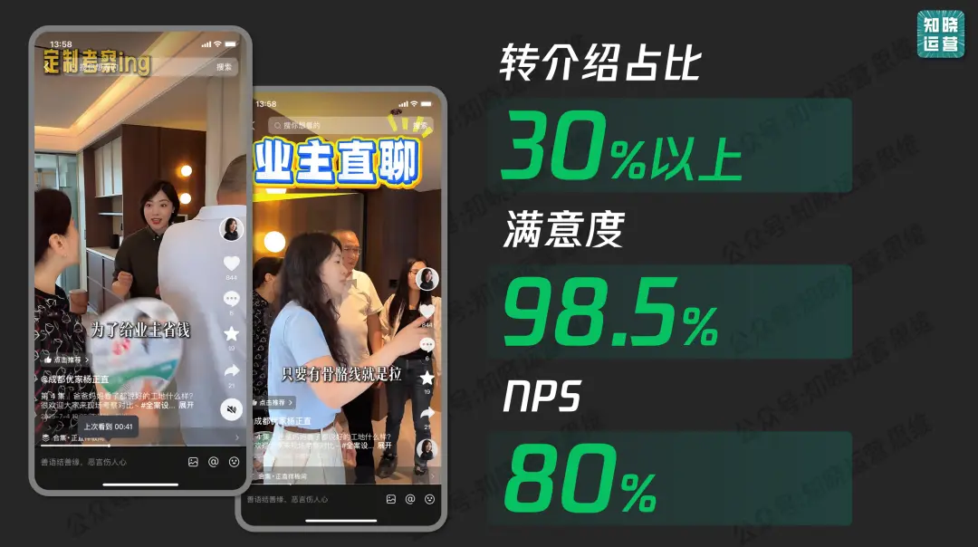 1. 线上探索:刷抖音、小红书,收藏、了解、咨询。 2. 线下初探:实地看5到8家公司,比模式、价格、设计。 3. 线上查证:回到网上查口碑、找实证,第一轮淘汰。 4. 线下再访:重点看2到3家决赛圈公司。 5. 线上求助:发帖求助、对比,问网友意见。 6. 最终决策/持续考察:选定了,但签合同前可能还在考察。 传统做法是客户来了就必须当场拿下,不能放走。但优家工场在用户转化的思路是,先尊重客户的习惯,不要求步步成交,而是先处关系,再谈生意。 如果第二步没成交,就把第四步做到极致,把前几步都变成积累信任的场合。 3、私域组织升级:前置服务与人才标准另外,他们提到了两个真实经历,展示了私域组织能力不匹配差点导致信任崩塌的问题: 第一线索承接案例,来自一位300平米大宅客户的失望 一位通过老板IP来的300平米客户,周六带上家人到店。结果展厅人多,没有VIP接待,客户一家人有点坐不下。 客户虽然客气地反馈聊得愉快,但实际上暗暗地表示体验并不满意,觉得接待规格没有达到预期。 虽然看似小事,但实际处处都是胜负手,当线索承接后,每一次的接触都是信任加减分的过程。 第二个信息透明的案例,来自邻居的信任危机: 另一位高线楼盘的客户,知道优家工场做过他邻居家的193平户型。老板在线上告诉他可以过来了解这个案例。 但客户到店后,顾问和设计师并不知道这个案例。 客户就直接问:是老板在忽悠我吗?还是你们有什么问题不方便告诉我? 这些细节反馈出,团队的服务流程已经不能满足当下获客方式带来的客户预期了。 所以,为了匹配新获客方式和客户期待,他们在私域组织上做了大调整: 第一,线上线下价格透明,说到做到: 线上承诺的价格和线下落地价必须完全一致,所有角色(顾问、设计师、项目经理、管家)在私域与面聊里都得言行一致。 第二,前置服务: 重点做好前置服务,比如,客户忙或不便时,设计师先上门量房、勘测、采集数据做预案。客户到店后沟通效率极高,成交率大大提升。 第三,调整人才标准: 他们辞退了那些虽然转化率高、但做不好全案和前置服务的“销冠”型设计师。现在更奖励服务满意度高、案例质量好的设计师,而不是只看业绩。 第四,个性化承接: 根据获客渠道打标,私域里承接的客户需要顺应不同内容过来的用户做区别对待,从老板号、设计师号、品牌号来的客户特点都不一样,根据前期沟通了解客户画像做针对服务,把体验做到极致。 优家工场也意识到私域不是成交阵地,是信任阵地。 做私域不是为了老给客户发活动或奖品,而是通过线下服务和线上互动,一步步把信任垒起来。 他们升级私域组织力,优化了运营服务SOP,优家工场也拿到了他们蜕变后的成绩单:
