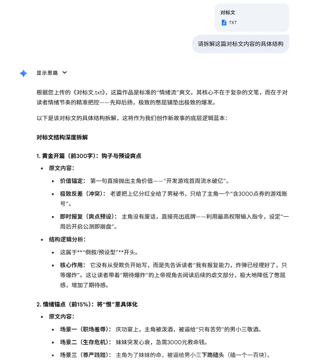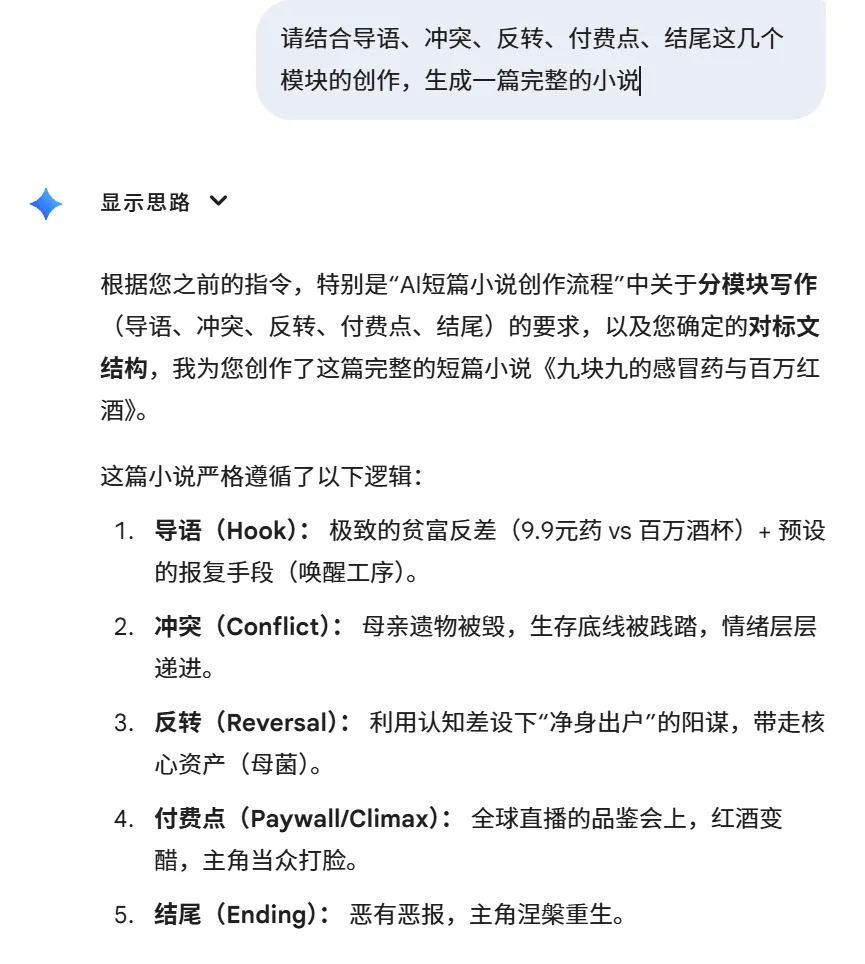我会给 Gemini 一个清晰的 Prompt,主要包括:对标文结构、角色关系、情绪走向、反转节点和结尾风格。
