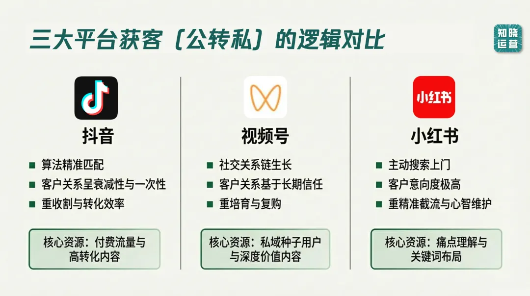 因为这三个平台的获客逻辑,会很不同,即使同样的内容放三个平台,数据呈现都会不一样。如果用抖音那套砸钱买量搞视频号,钱花了人也跑了;