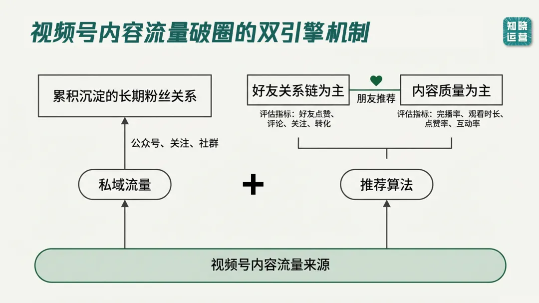 那么视频号的推流逻辑也会有所不同,即:私域流量+推荐算法(好友关系链+内容质量指标)