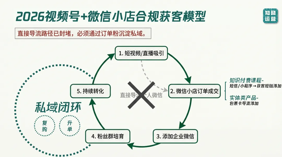短视频/直播吸引(前期私域+微信公域内容铺垫) → 微信小店订单成交 → 添加企微 → 粉丝群培育 → 持续转化(1V1成交或私域发售成交)。