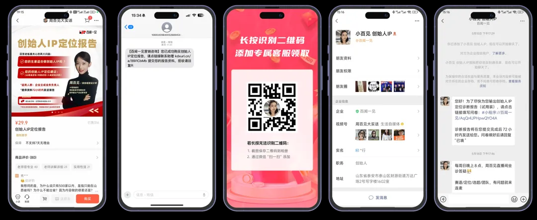 比如以知识IP周百见的链路,通过直播流量,到微信小店成交低客单课程,再通过短信上课导流添加企微助理,这个过程就属于合规且有信任的丝滑导流。