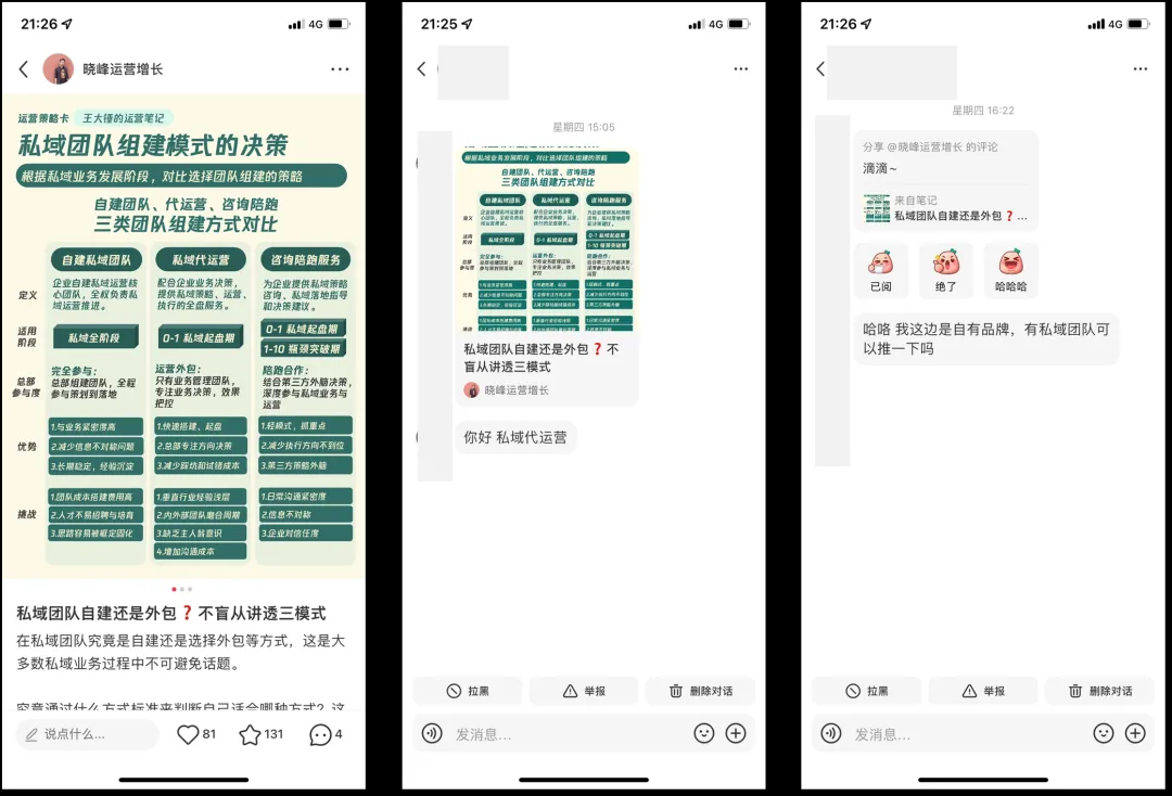它是寻找解决方案的需求场域,比如我一条2024年的笔记讲“私域团队要自建还是找代运营”,到今天都依然有人私聊我,有没有代运营服务或推荐的私信线索。