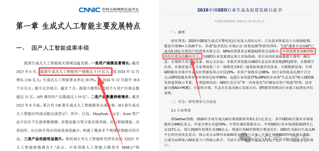 为什么现在大家都在聊GEO?第一、AI提供的建议或答案可以是广告,触达更直接;第二、目前全国有5.15亿人在用AI搜答案;第三、老百姓对AI的信任评分高达80分…大家一致认为GEO这个广告要不了两年,可能比权威媒体、大V推荐更让人信任。