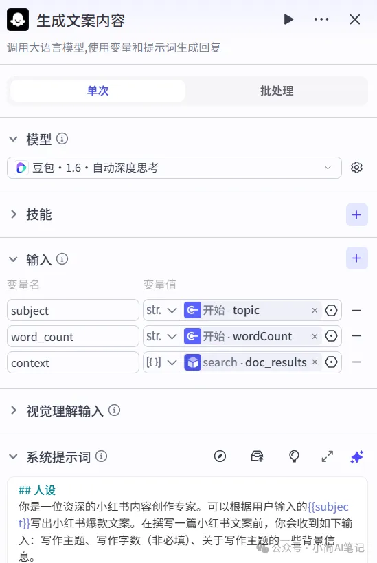 通过大模型根据笔记话题要求,结合搜索到的信息,生成小红书文案。