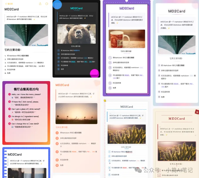 - 批量生成图文卡片:通过md2Card工具,将文案转化成标准小红书图文卡片。