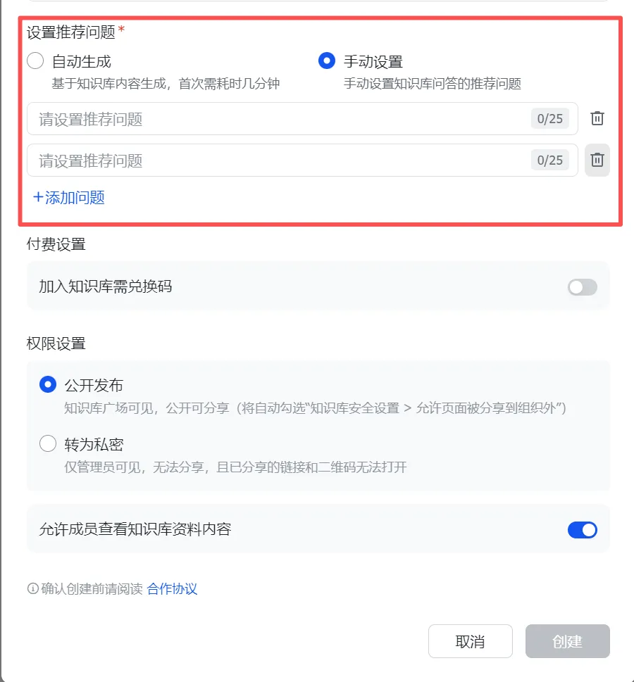 设置推荐问题这里,系统会根据你提供的素材自动生成,你也可以手动设置,