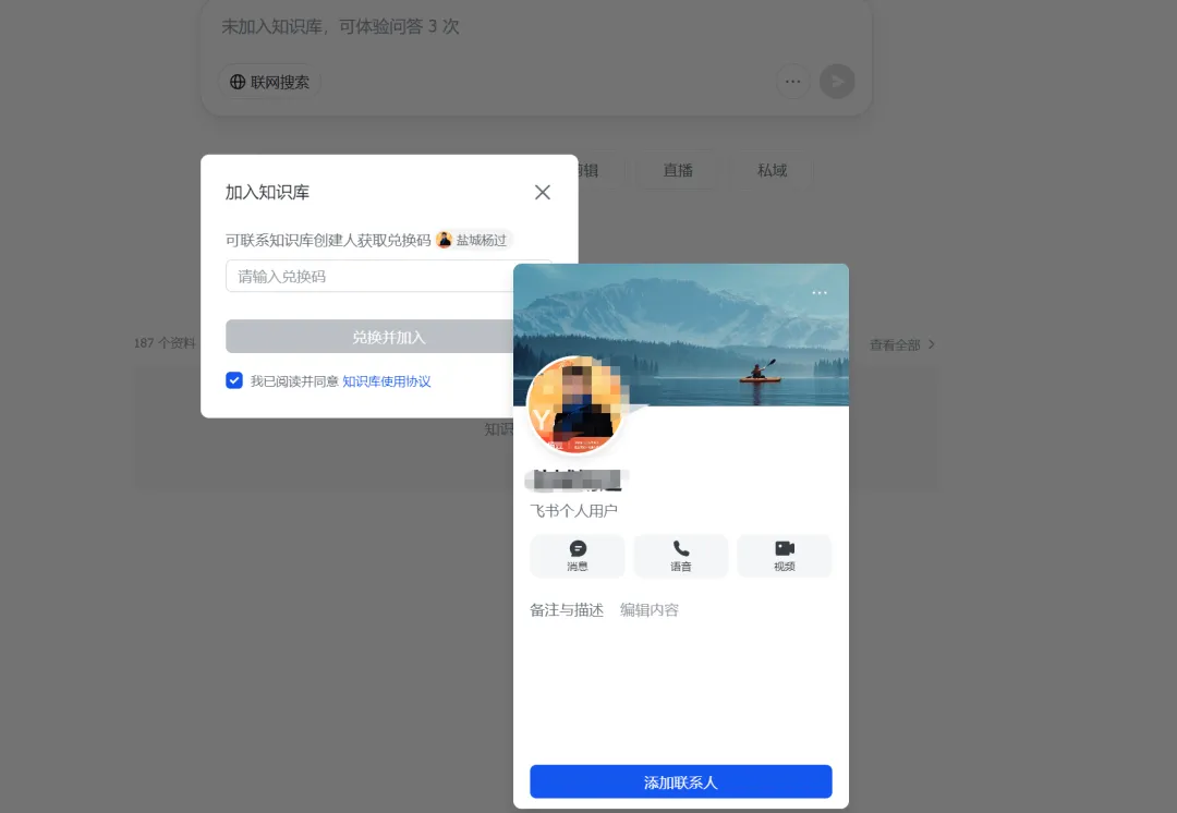 点击昵称就会跳转到添加飞书好友,你也可以在描述里面植入联系方式,比如微信