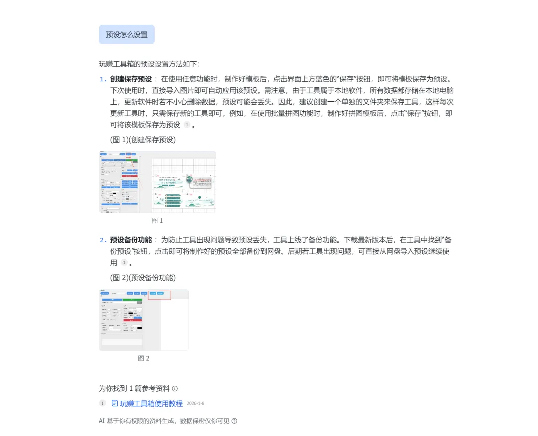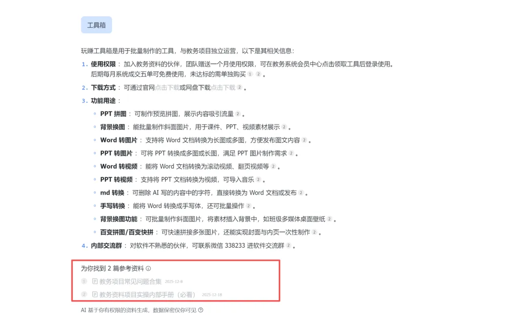如果你有知识问答这个功能,只要你能访问的资料,都可以直接调取作为问答,不过这种只能自己使用