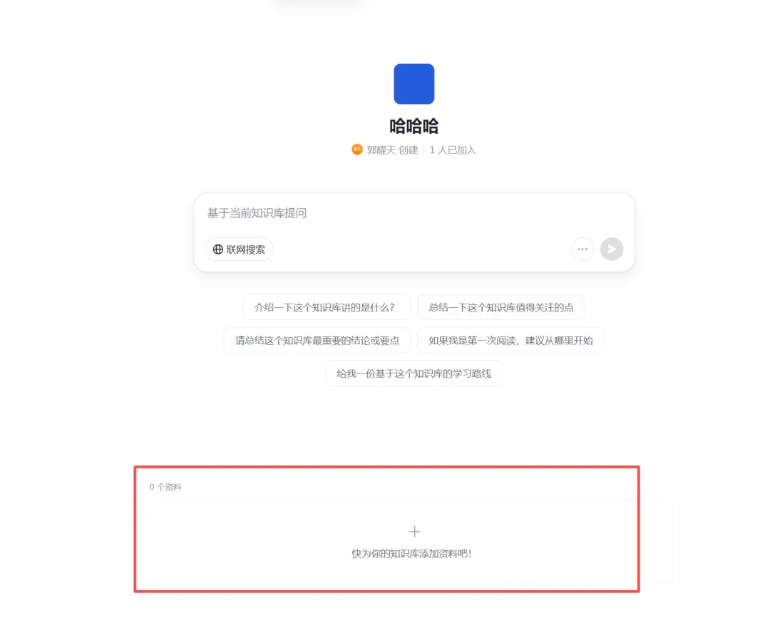 打开创建的知识库,点击底部,点击添加资料,这里说下,马上上传的资料,会有几分钟的学习时间,马上上传无法马上搜索出来,几分钟后上传的资料就可以搜索了。
