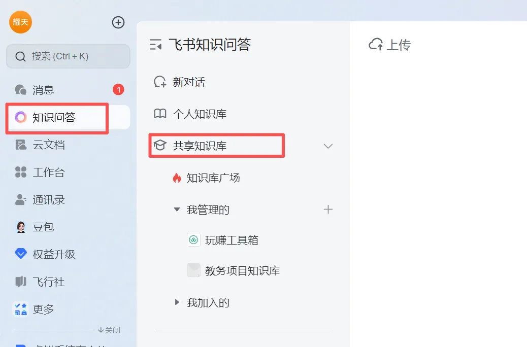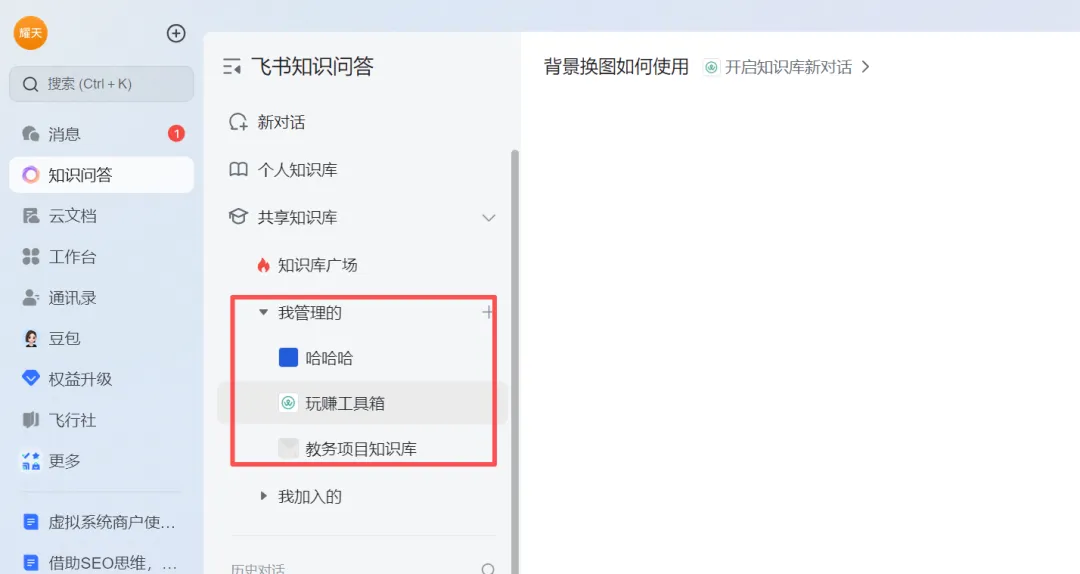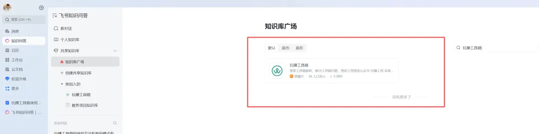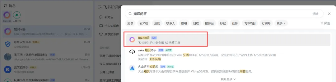 如果你打开飞书,没看到知识问答菜单,点击顶部搜索,输入知识问答,使用几次,菜单就出知识问答了