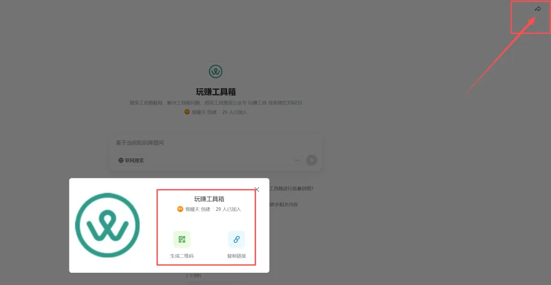 打开你创建的知识库,右上角有个转发按钮,点击进入,就可以看到生成二维码,还有复制链接