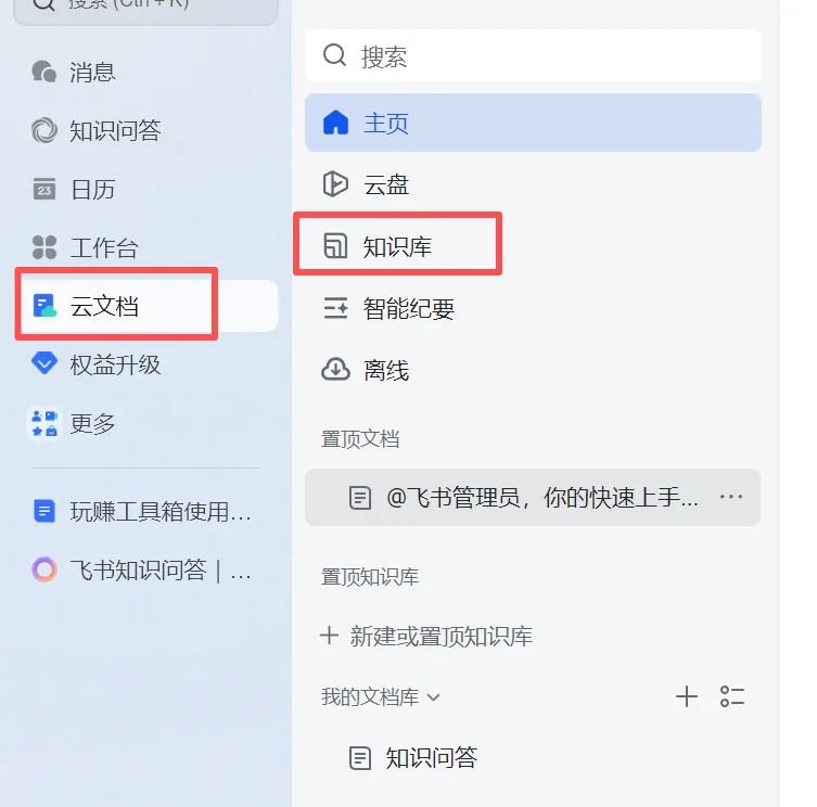 需要点击飞书云文档,点击知识库,找到你创建的知识库
