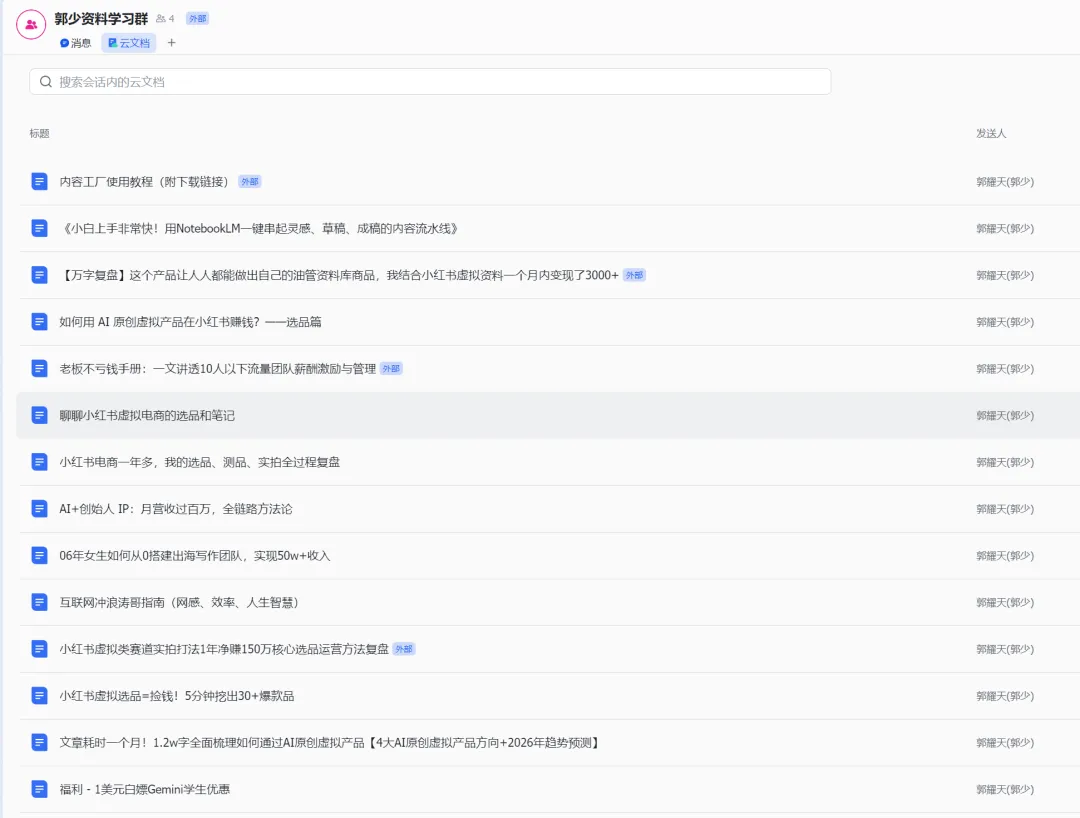 所以星球看到好的内容,我都创建一个飞书群,直接把别人链接保存到飞书群,一些无法及时学习的,或者是垂直的内容,后期我搜索问答的时候,可以根据素材给我 回答,相当于我的一个老师,随时解决我遇到的问题。