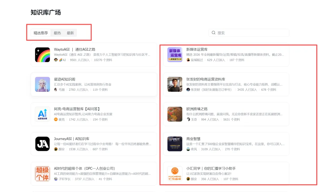 可以看到知识库广场,进入广场,可以直接加入别人搭建好的知识问答库,也也可以搜索关键词加入