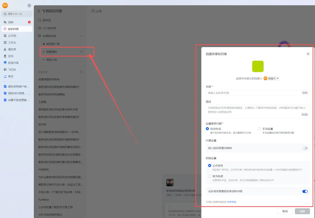 进入创建页面,填名称,介绍,名字可以根据你的课程,服务群体,细分名字创建,现在还不是很多,可以抢不少好的名字,先去占领,谁能第一时间搭建一些用户需求的,可以获得更多的粉丝,还有可能获得官方的推荐,展示到精选里面,打开就可以看到你的问答知识库。