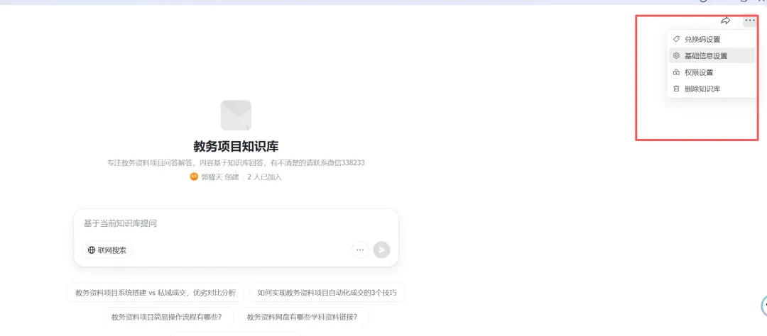 完善的知识库,前期可以根据需求设置,需要设置的伙伴,点击知识库右上角,就可以看到设置页面